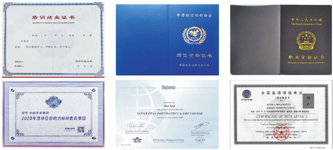 学员可根据所学课程,参加相关部门或行业组织的考试,成绩合格,可取得相应的职业资格证书,如公共英语三级证书、普通话等级证书、安检证书、航空应急救援证、民航客运证、急救证、礼仪证书、茶艺证书、民航客舱乘务员培训合格证、CAAC执照、基本安全培训合格证等。
